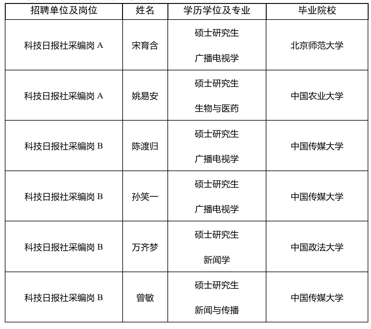 目前,尚有采编岗B(1人)正在进行体检考察,尚未完成招聘程序,将另行公示。