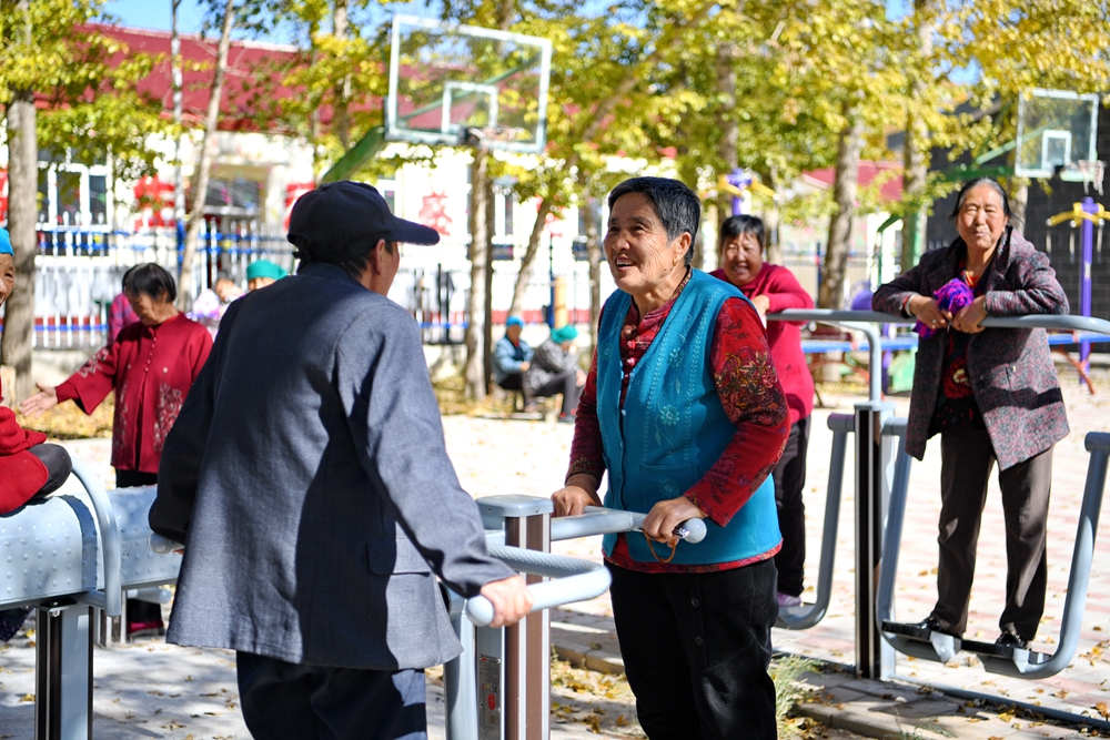 居住在河北省康保县土城子镇互助幸福院的老人们在院子里休闲(2023年10月14日摄)。新华社记者 牟宇 摄