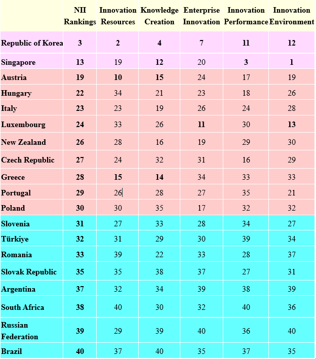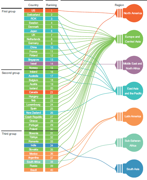 The Republic of Korea (ranked the 3rd) and Singapore (13th) have performed outstandingly, maintaining their position in the first group. 9 countries, including Austria (19th), Hungary (22nd), Italy (23rd), Luxembourg (24th), New Zealand (26th), the Czech Republic (27th), Greece (28th), Portugal (29th) and Poland (30th) ranked in the second group. 8 countries, including Slovenia(31st), Türkiye (32nd), Romania (33rd), Slovak Republic (35th), Argentina (37th), South Africa (38th), the Russian Federation (39th) and Brazil (40th), are in the third group.