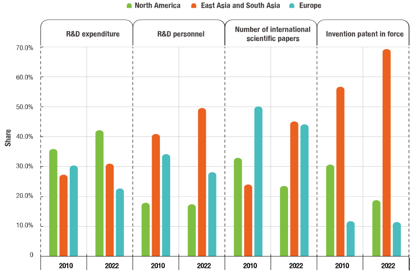 The shift in the priorities of innovation resource input results in a corresponding shift in the output of innovation activities. The global share of scientific papers produced by East and South Asian countries in the Asian region climbed from 24.0% in 2010 to 45.1% in 2022, up by 21.1 percentage points. The share of North American countries dropped from 32.9% in 2010 to 23.5% in 2022, down by 9.4 percentage points. The share of European countries dropped from 50.1% in 2010 to 44.1% in 2022, down by 6 percentage points.