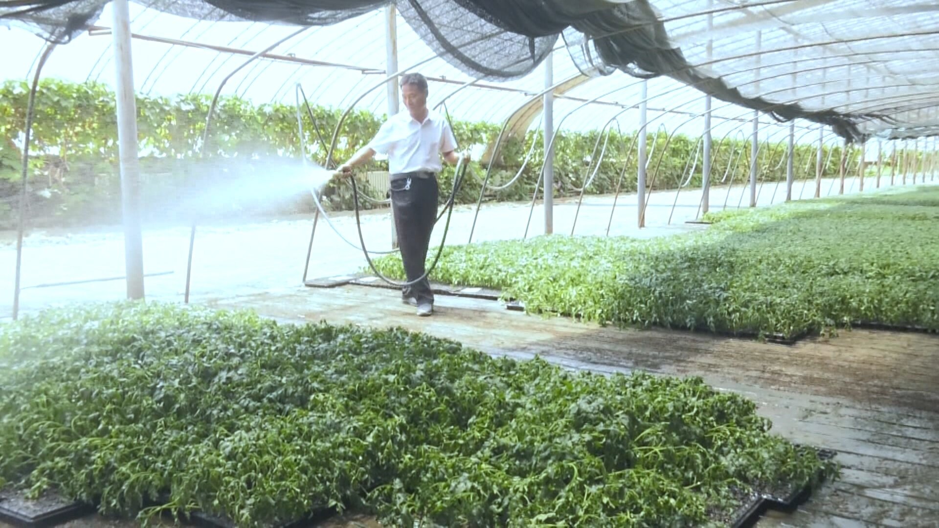 陈林先在依干其镇良种尤喀克乔格塔勒村领先农民合作社的育苗基地给菜苗进行浇水。