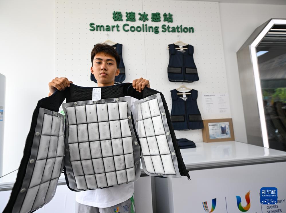 炎炎夏日,在户外工作的大运会志愿者群体将如何应对严峻的天气挑战?由成都温江“智造”采用PCM(常用于航天领域的新型恒温材料)制成的降温冰背心,广泛运用于大运会志愿者群体,帮助其在“大运之夏”保持冰爽。据产品负责人介绍,降温冰背心主要点位位于科技服务工作站,背心具有存储和释放潜热调节剧烈温差的功能,是通过自身相态转换来进行吸热或放热,并根据环境温度的变化在服装周围形成温度相对恒定的微气候,实现温度调节功能,从而达到温度始终保持在18℃/23℃/28℃,相当于随身携带了一个“空调”,“使用时只需要把‘内芯’提前半小时放入冰箱,就可以在30多度的户外,持续提供2个小时的‘清凉’。”