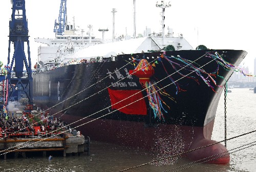 2008年4月3日,中国建造的第一艘液化天然气(LNG)船在上海交付船东。新华社记者 陈飞 摄