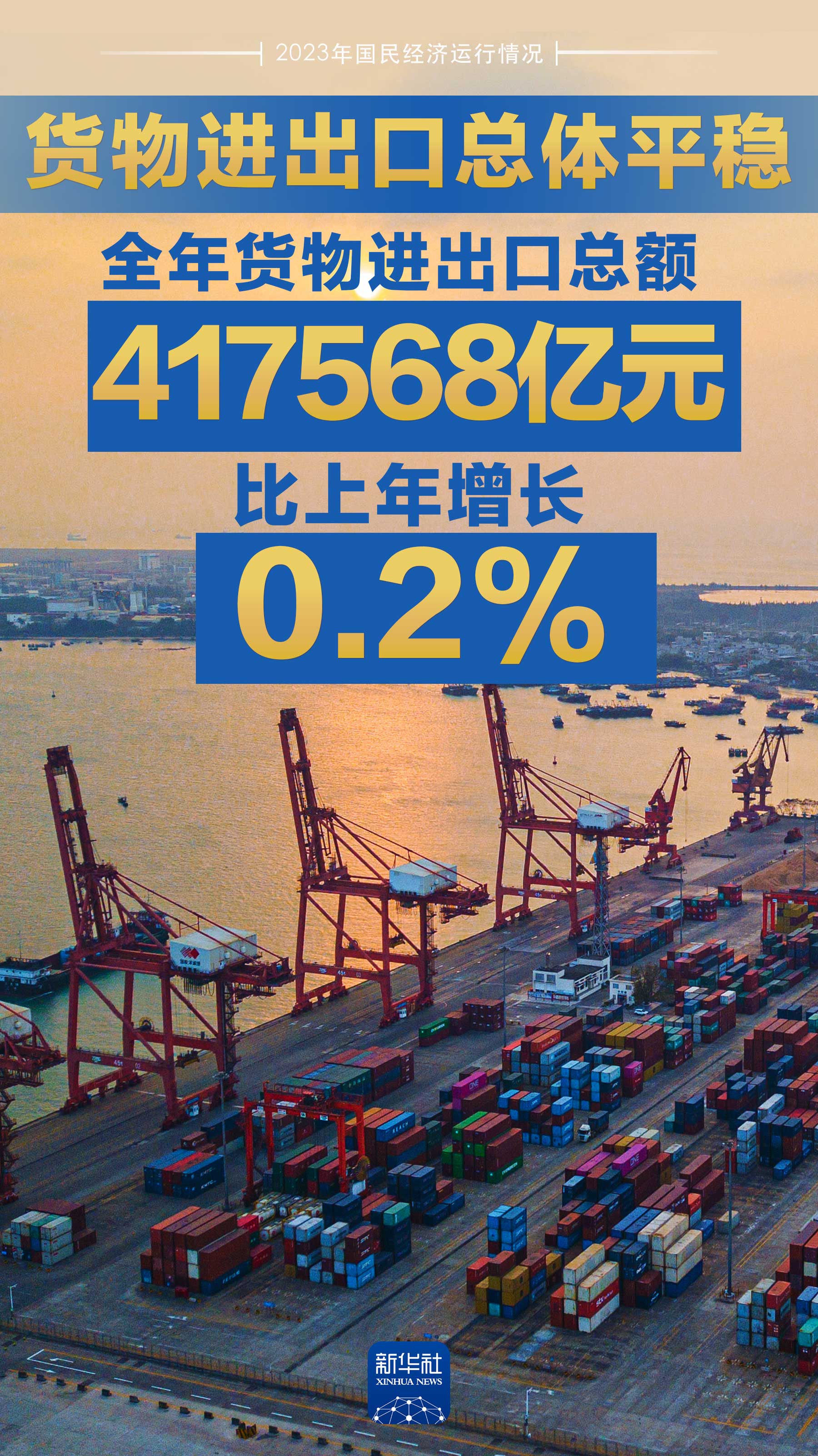 2023年我国外贸运行总体平稳:全年货物进出口总额417568亿元,比上年增长0.2%。其中,出口237726亿元,增长0.6%;进口179842亿元,下降0.3%。进出口相抵,贸易顺差57884亿元。电动载人汽车、锂离子蓄电池和太阳能电池等“新三样”产品合计出口首次突破万亿元大关,增长29.9%。