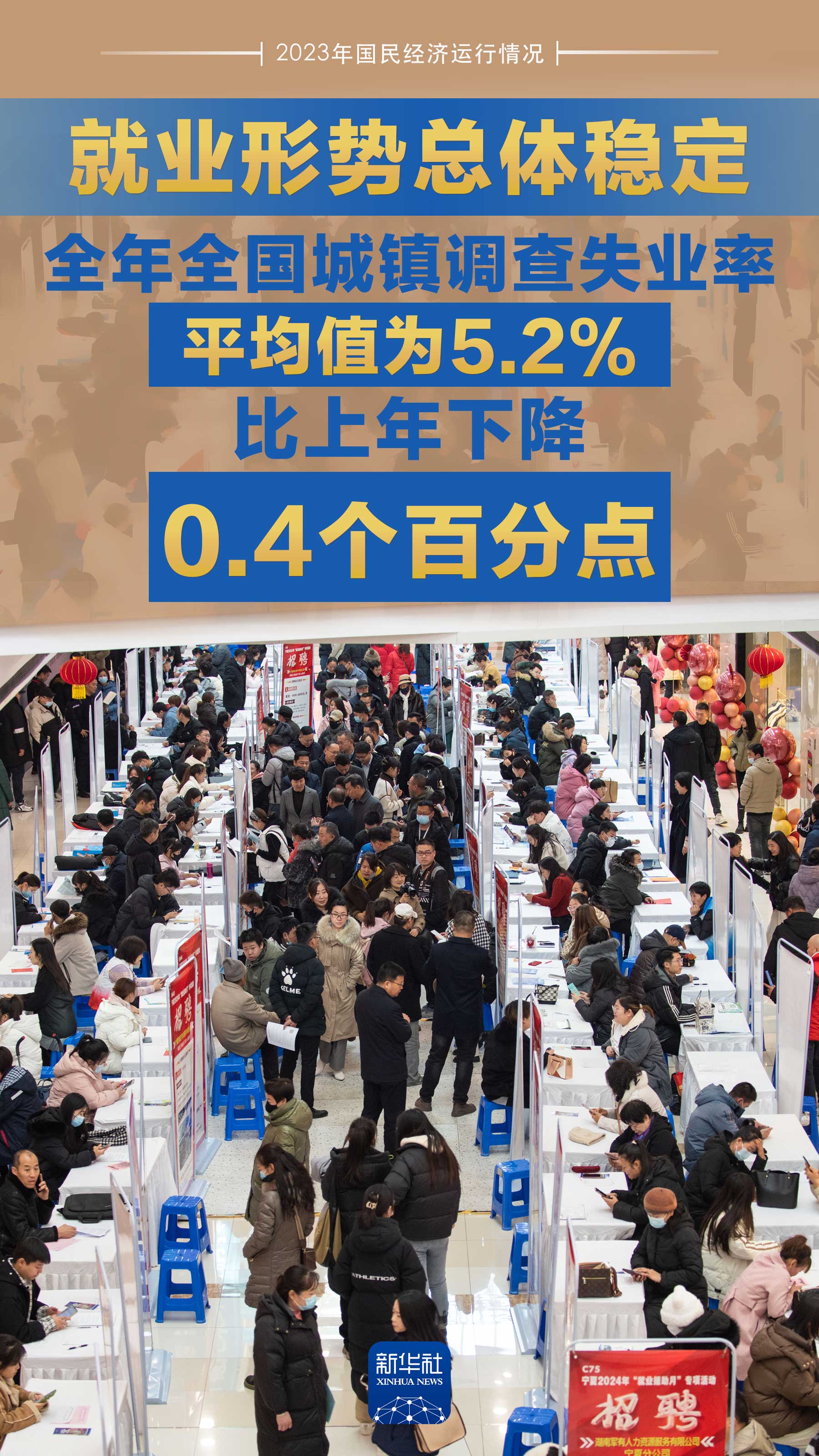 全年全国城镇调查失业率平均值为5.2%,比上年下降0.4个百分点