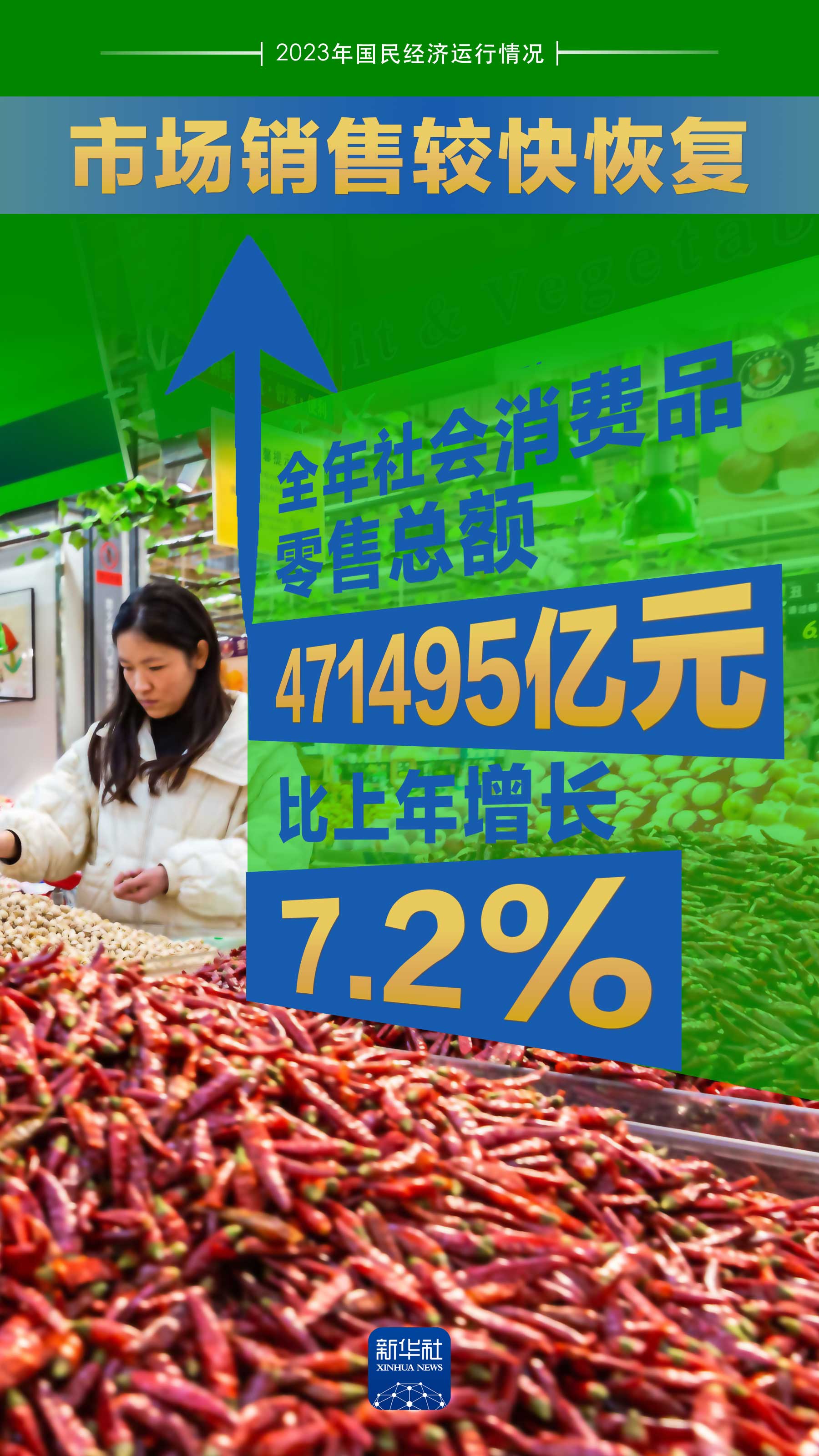 2023年消费市场恢复向好,热点亮点多,成为带动经济恢复的重要力量:社会消费品零售总额471495亿元,创历史新高,比上年增长7.2%。
