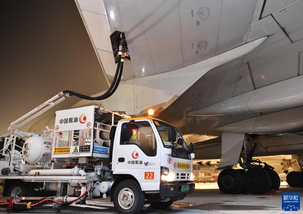 2023年8月1日,在中国郑州新郑国际机场,中国航油华南蓝天河南分公司的工作人员为一架卢森堡货航货机加油。新华社记者 李嘉南 摄