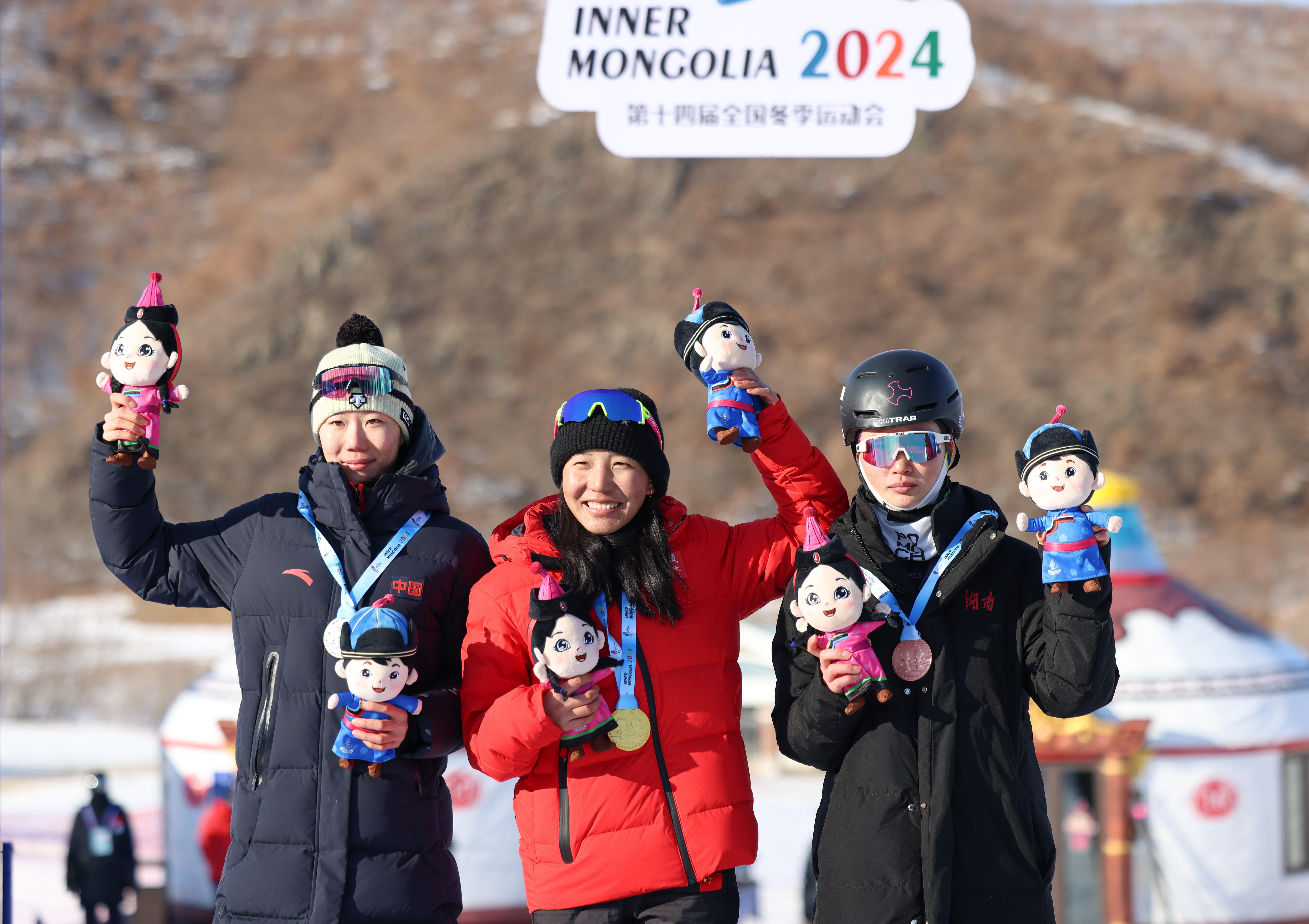 1月30日,冠军西藏选手玉珍拉姆(中)、亚军吉林选手任彤(左)和季军湖南选手卯升梅在颁奖仪式上。 新华社记者 王楷焱?摄