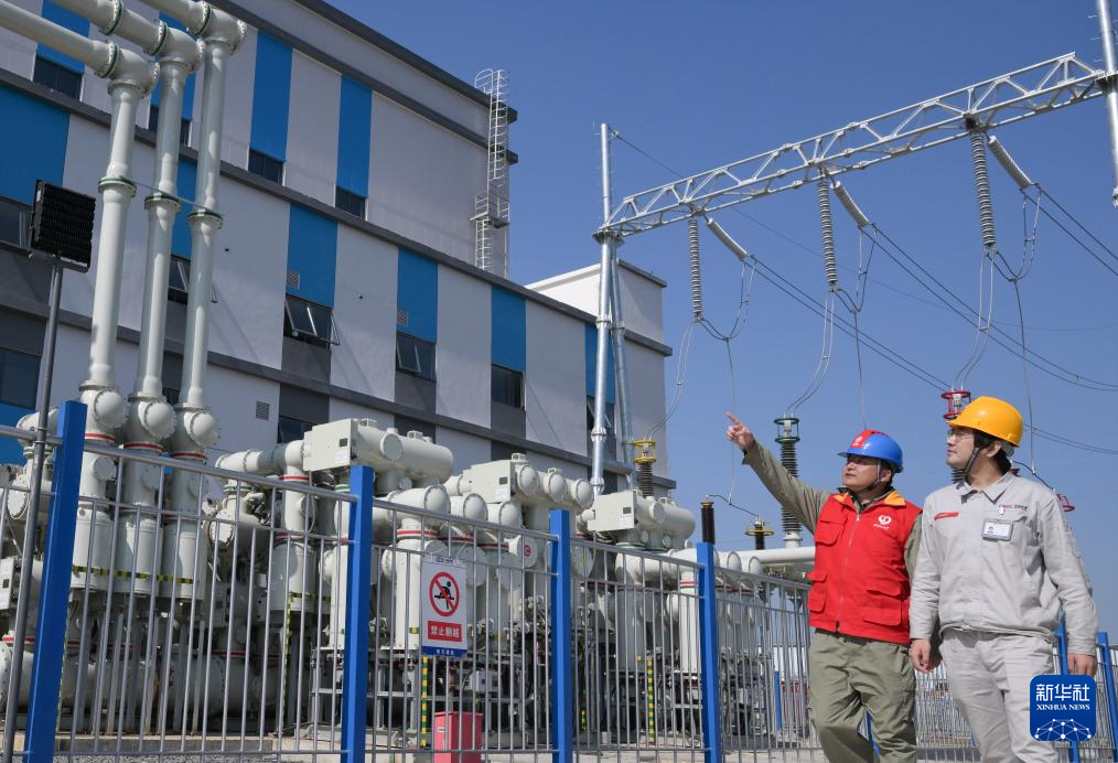 4月9日,国网孝感供电公司技术人员(左)与应城300兆瓦级压缩空气储能电站操作人员在巡视电力设备,确保设备运行正常。新华社记者 程敏 摄
