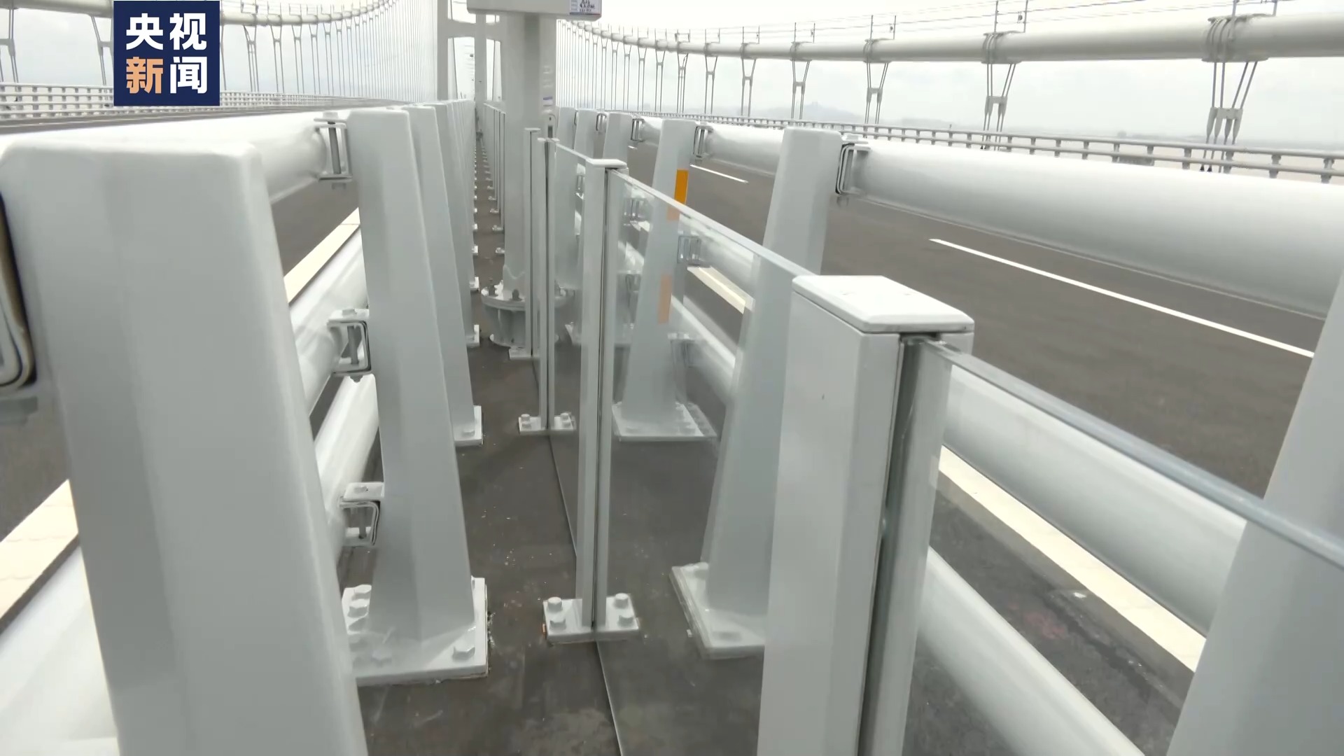 总台央视记者曹丹说,在深中大桥的桥面中心位置,隐藏着一道玻璃墙。看上去就是一块块普通的钢化玻璃,但是它们却是深中大桥抗风的“秘密武器”。