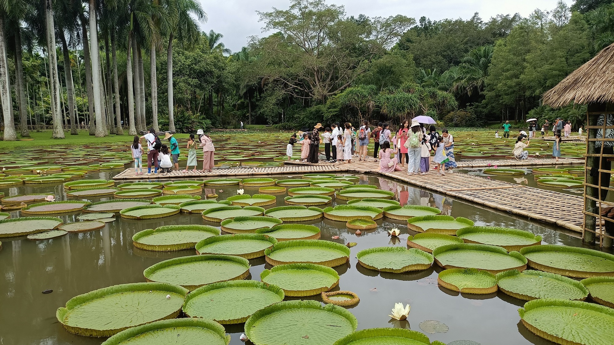 能承重上百斤的王莲、拥有有花植物中最大花的巨魔芋、夜晚会发出绿色荧光的发光蘑菇……版纳植物园内收集保存的14000多种植物中,珍稀濒危植物1675种、国家重点保护野生植物353种,保存种子植物250科,隶属于13种分布区类型,其中典型热带分布的科有156个,占比为62.4%……建园65年来,版纳植物园已发展成为集物种保存、科学研究和科普教育为一体的综合性研究机构。