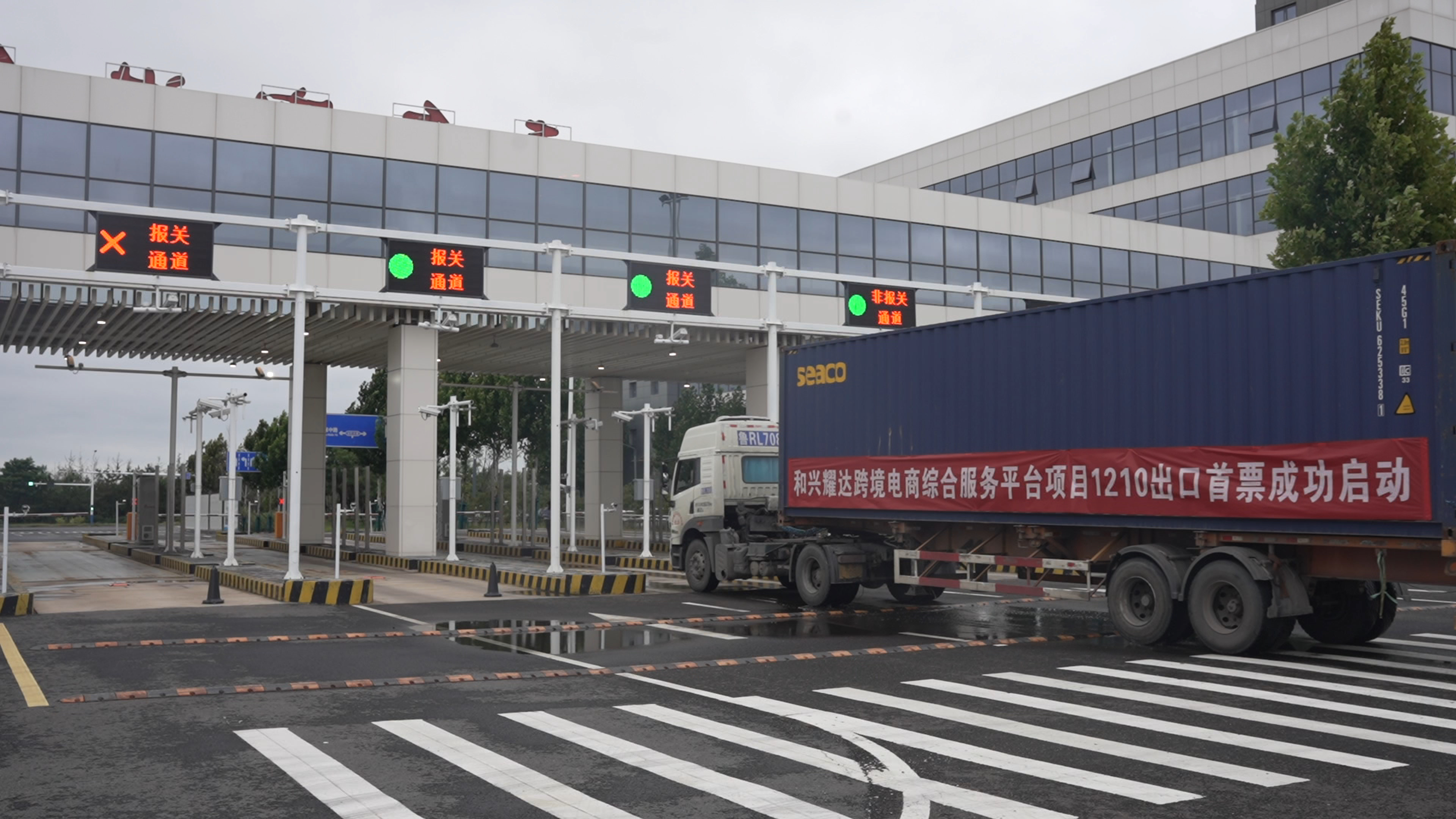 8月28日,一辆满载假发、轮胎、支架等货物的厢式货车,从海关监管通道驶出青岛空港综合保税区,前往青岛胶东国际机场运往美国。