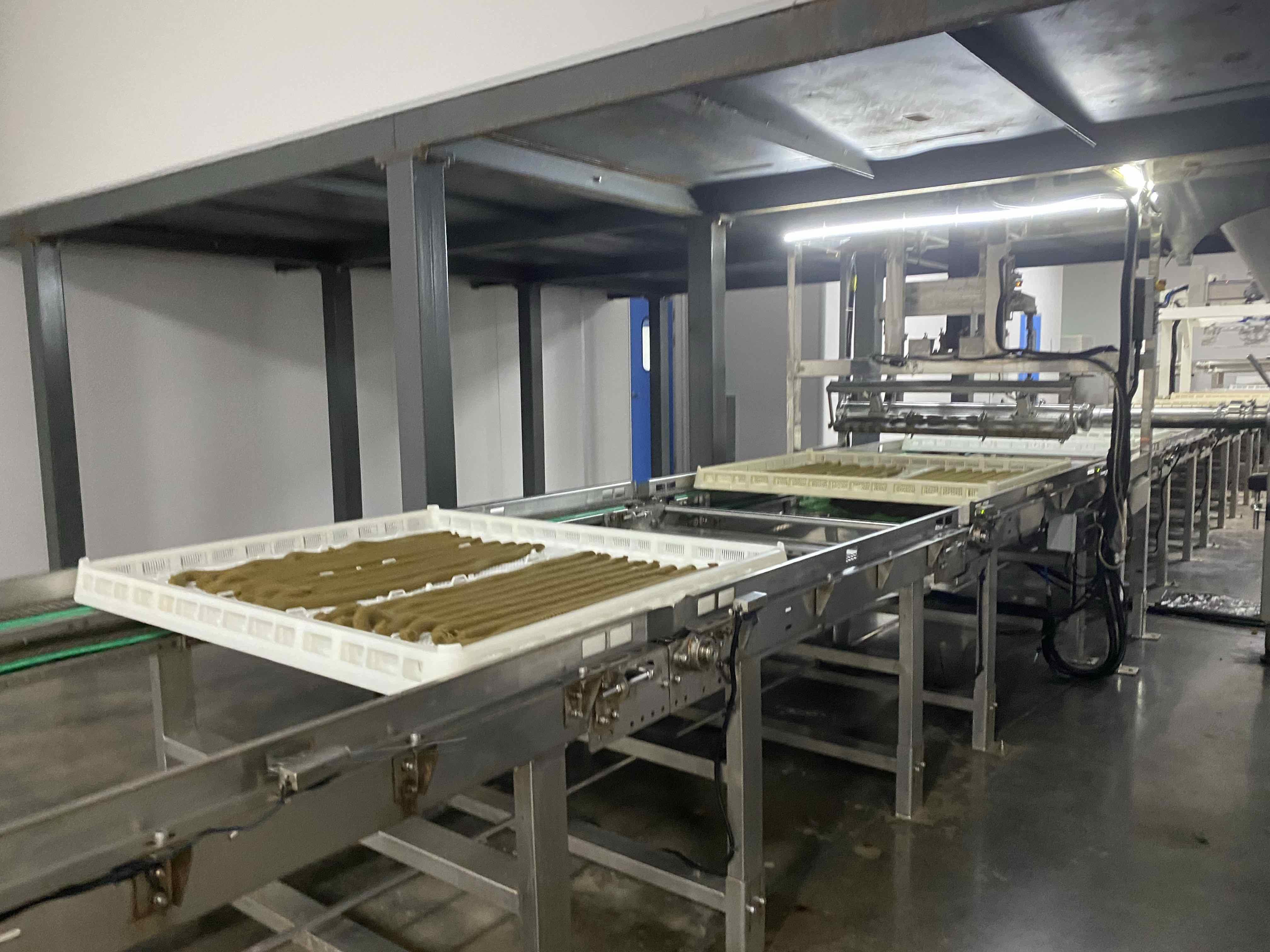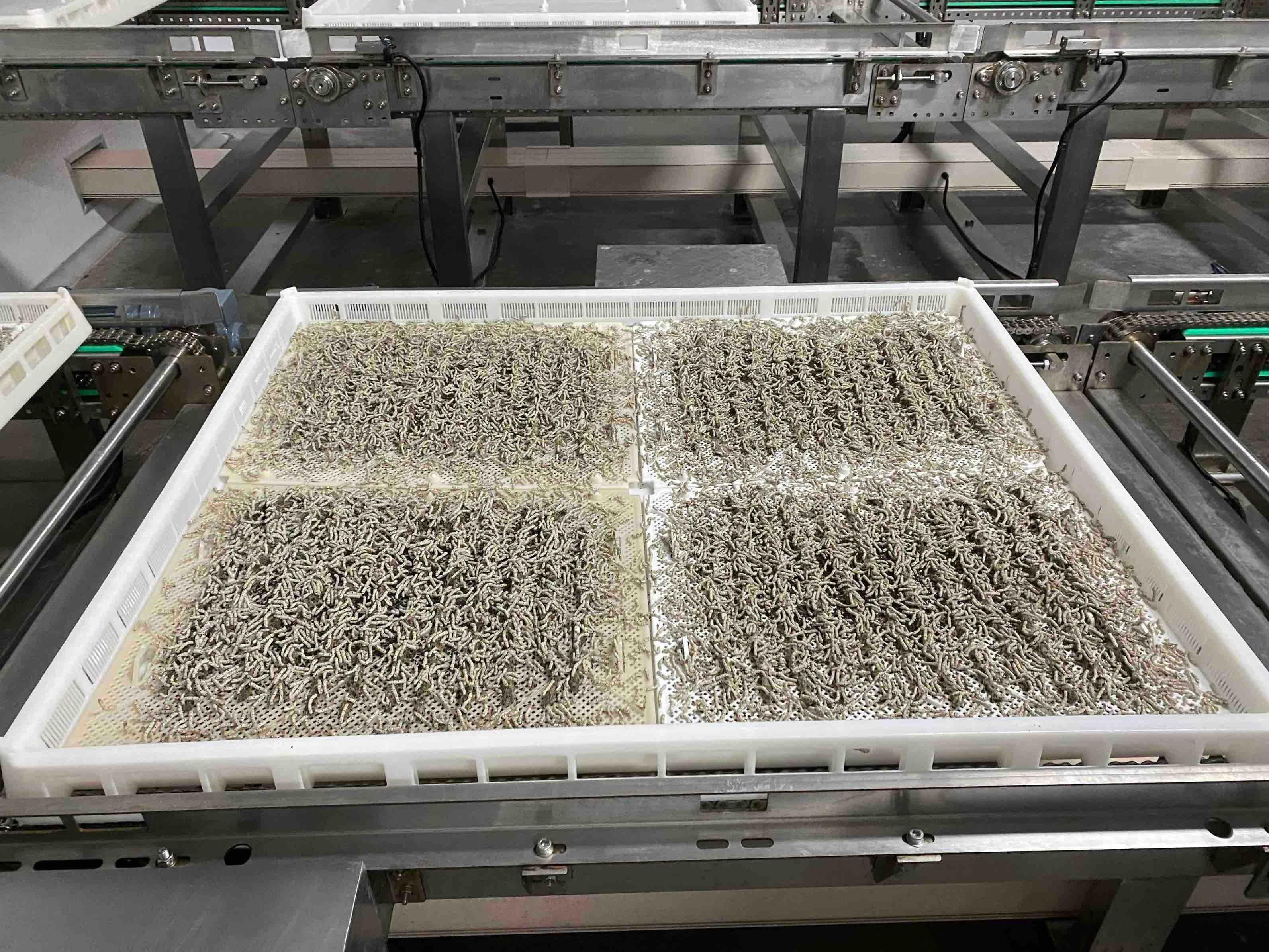 穿上一体式无菌服、戴上无菌手套和口罩,携带的设备经过酒精消杀,再穿过两道门,记者才能走入进厂房近距离看蚕宝宝。只见全自动化的流水线上,一排排白色饲养盘依次传送,里面爬满了白白胖胖的蚕宝宝。不同的是,蚕宝宝身下不见桑叶,而是铺着一条条褐色的泥状物。