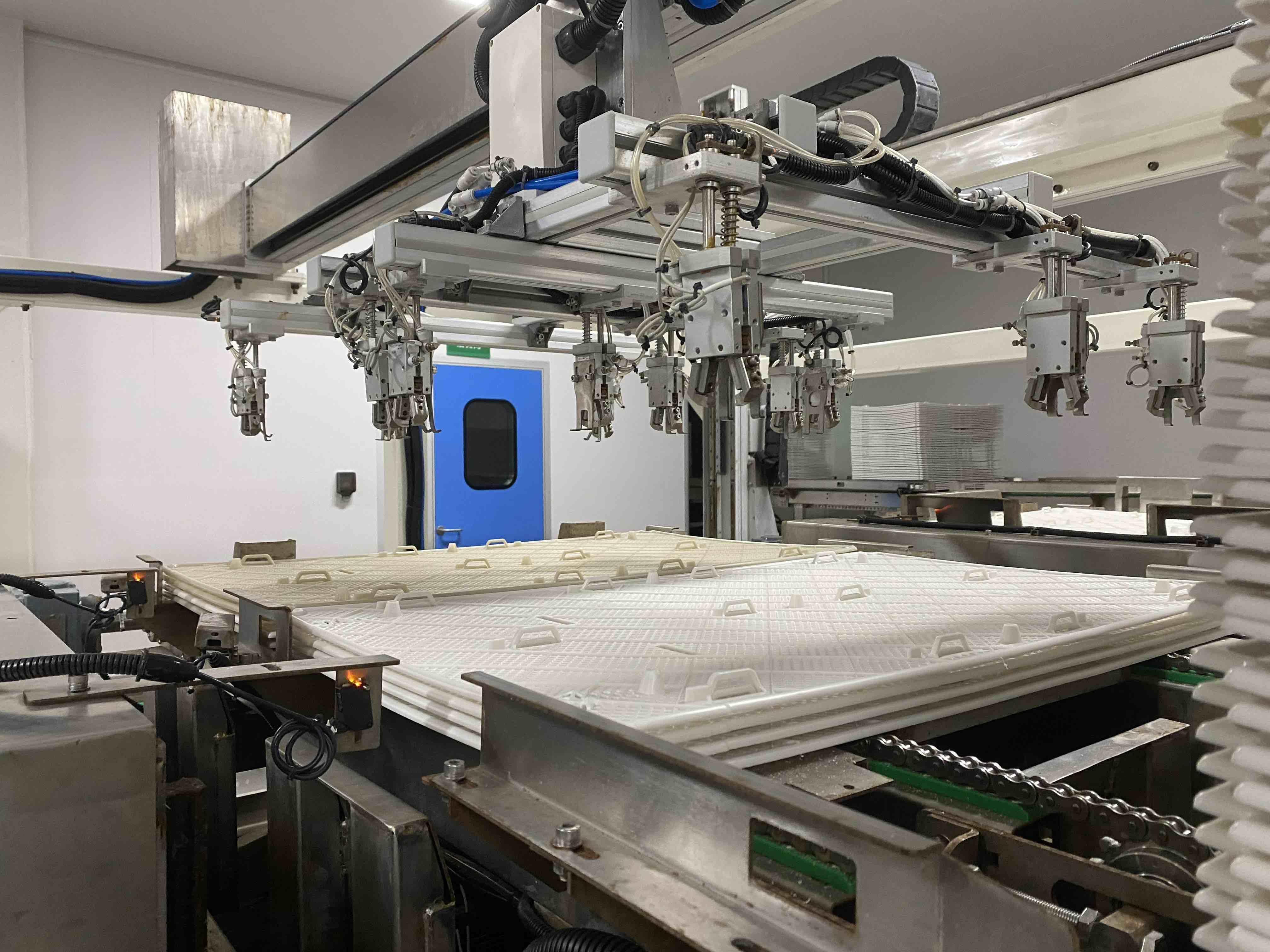 中茧新科还从养殖密度、空间利用率、生产批数等方面进行了创新。他们结合工厂化养蚕,研制出注塑厂房。利用这里生产的饲养盘,可以实现多层堆垛,实现了从传统养蚕一平米600只,到目前的一平米2000—3000只。虽然养蚕密度达到了传统人工养蚕的将近5倍,可一趟走下来,却没看到几个工人。沿路都是自动化的流水线在默默工作,还有一个个的AGV智能机器人来回奔波。