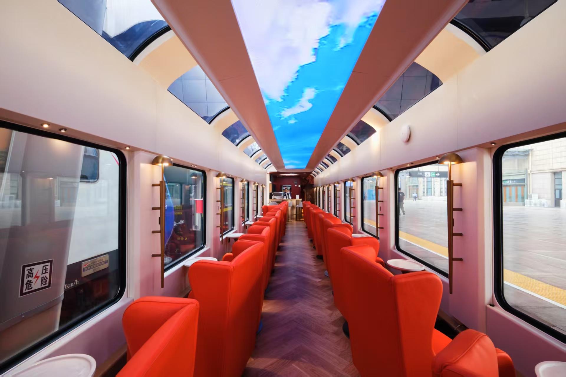 多功能娱乐车厢和全景观光车厢配备智能交互显示屏和顶部LED天幕,将科技创新与文化旅行深度融合;创新采用超大观景窗、侧顶天窗与顶部LED天幕无缝衔接,让燕山叠翠与华北平原的壮阔风光一览无余,让旅客沉浸于“车在景中行,人在画中游”的极致体验。