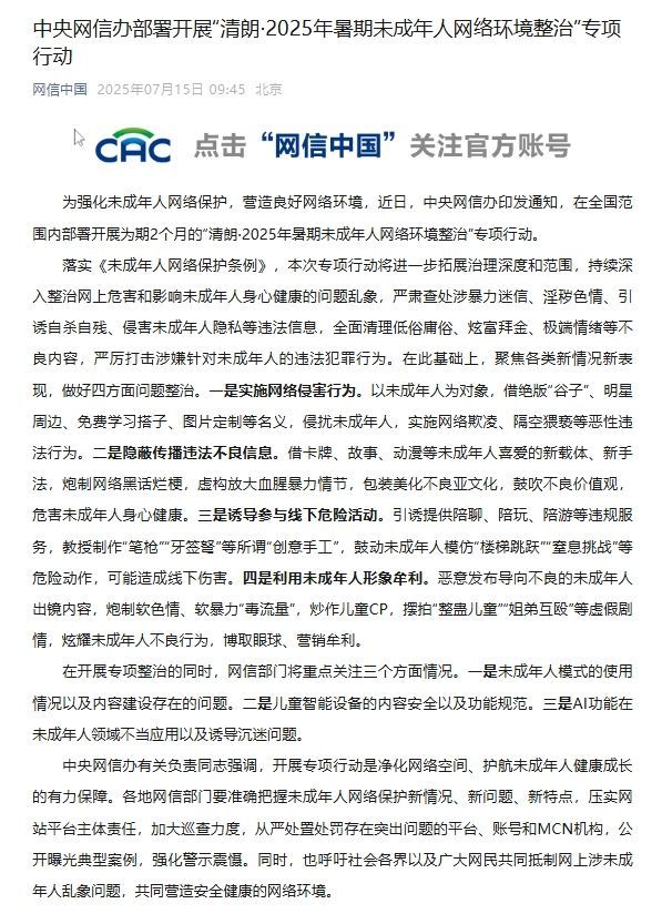 为强化未成年人网络保护,营造良好网络环境,近日,中央网信办印发通知,在全国范围内部署开展为期2个月的“清朗·2025年暑期未成年人网络环境整治”专项行动。