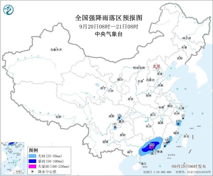 预计,9月20日8时至21日8时,广东大部、广西东部、福建东南部、浙江南部以及重庆西部、四川东南部、云南东北部等地的部分地区有大到暴雨,其中,广东中部的部分地区有大暴雨(100~220毫米)。上述部分地区伴有短时强降水(最大小时降雨量20~60毫米,局地可超过80毫米),局地有雷暴大风等强对流天气。