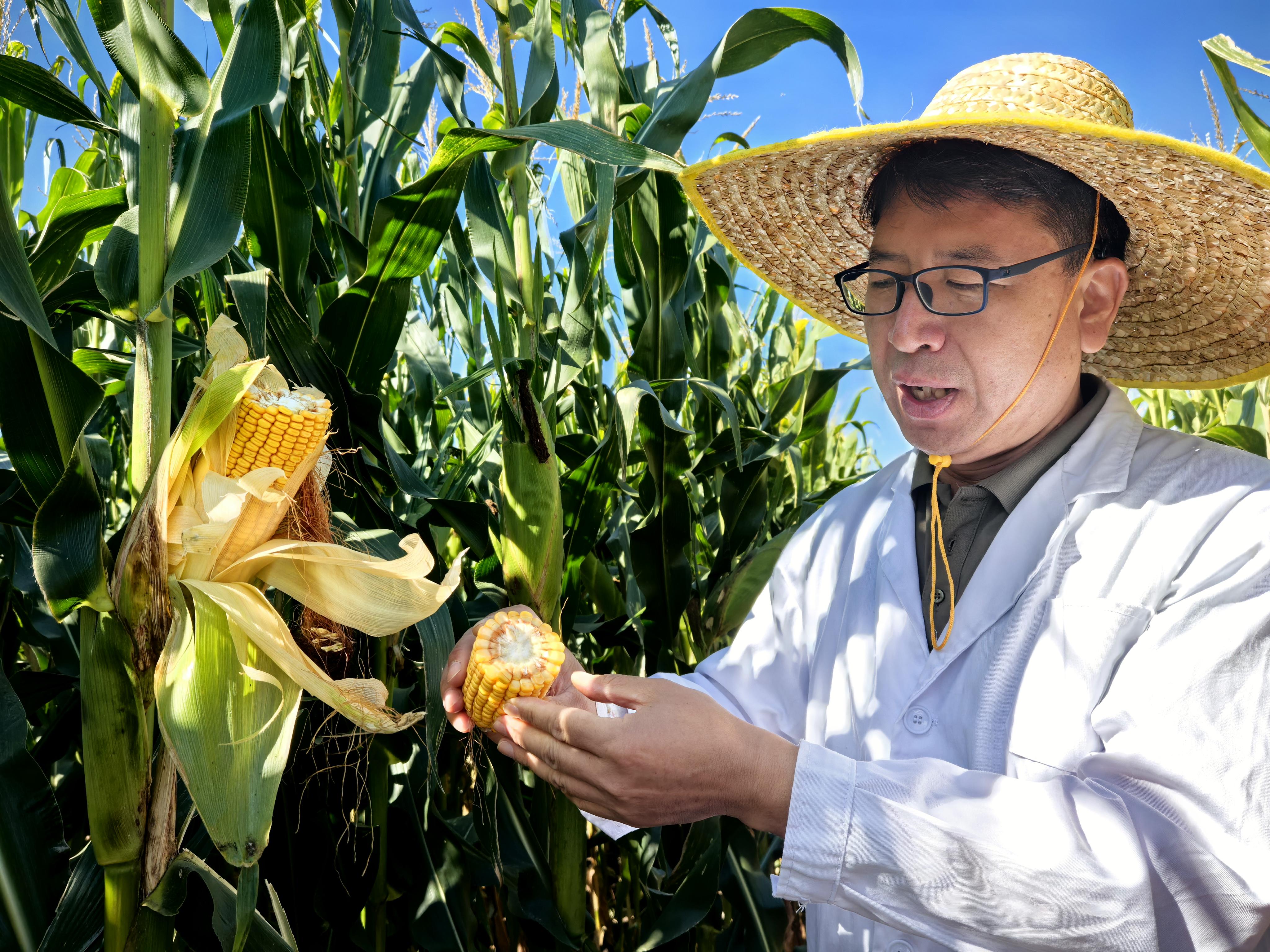 “这颗种子,我们足足培育了13年。”项目课题组负责人孙德全研究员蹲在田埂上,掰下一穗玉米,指尖轻抚饱满的籽粒,语气里满是骄傲,“这一穗有1公斤多重,占了整个植株的50%。大面积种植每亩生物产量稳定在4.5吨以上。”