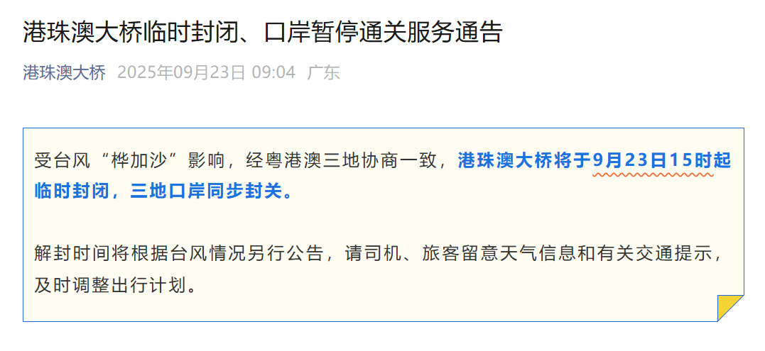 9月23日上午,港珠澳大桥管理局发布公告,受台风“桦加沙”影响,经粤港澳三地协商一致,港珠澳大桥将于9月23日15时起临时封闭,三地口岸同步封关。