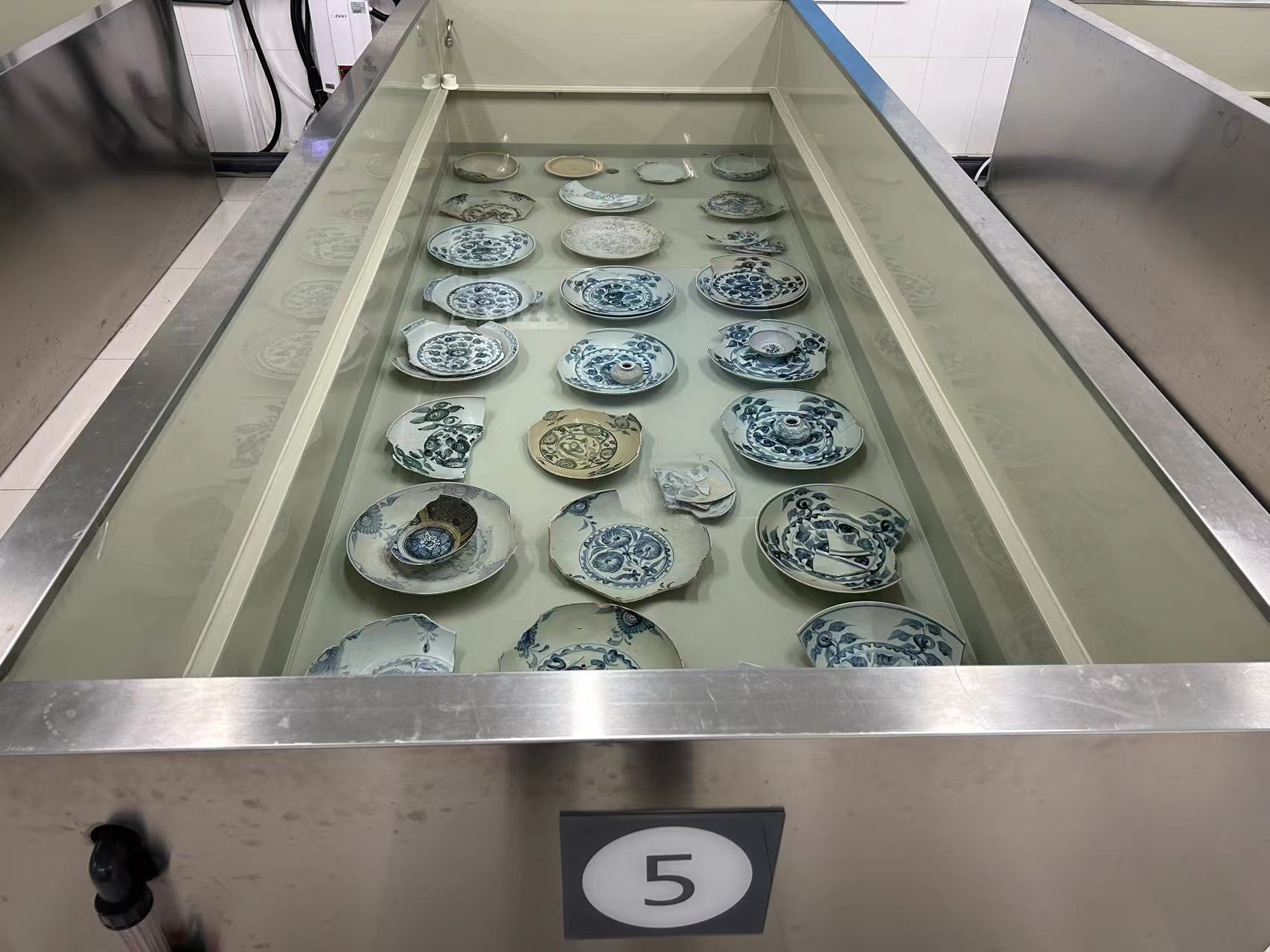 洗干净表面还不够,文物内部也要深层清洗。海洋出水文物表面和内部的大量可溶盐,堪称文物内部的“隐形杀手”。这些盐分藏在瓷胎和釉层里,一旦环境温湿度变化,就会反复溶解、结晶,产生的机械应力会导致瓷胎酥松脆弱、釉层和彩绘脱落等。