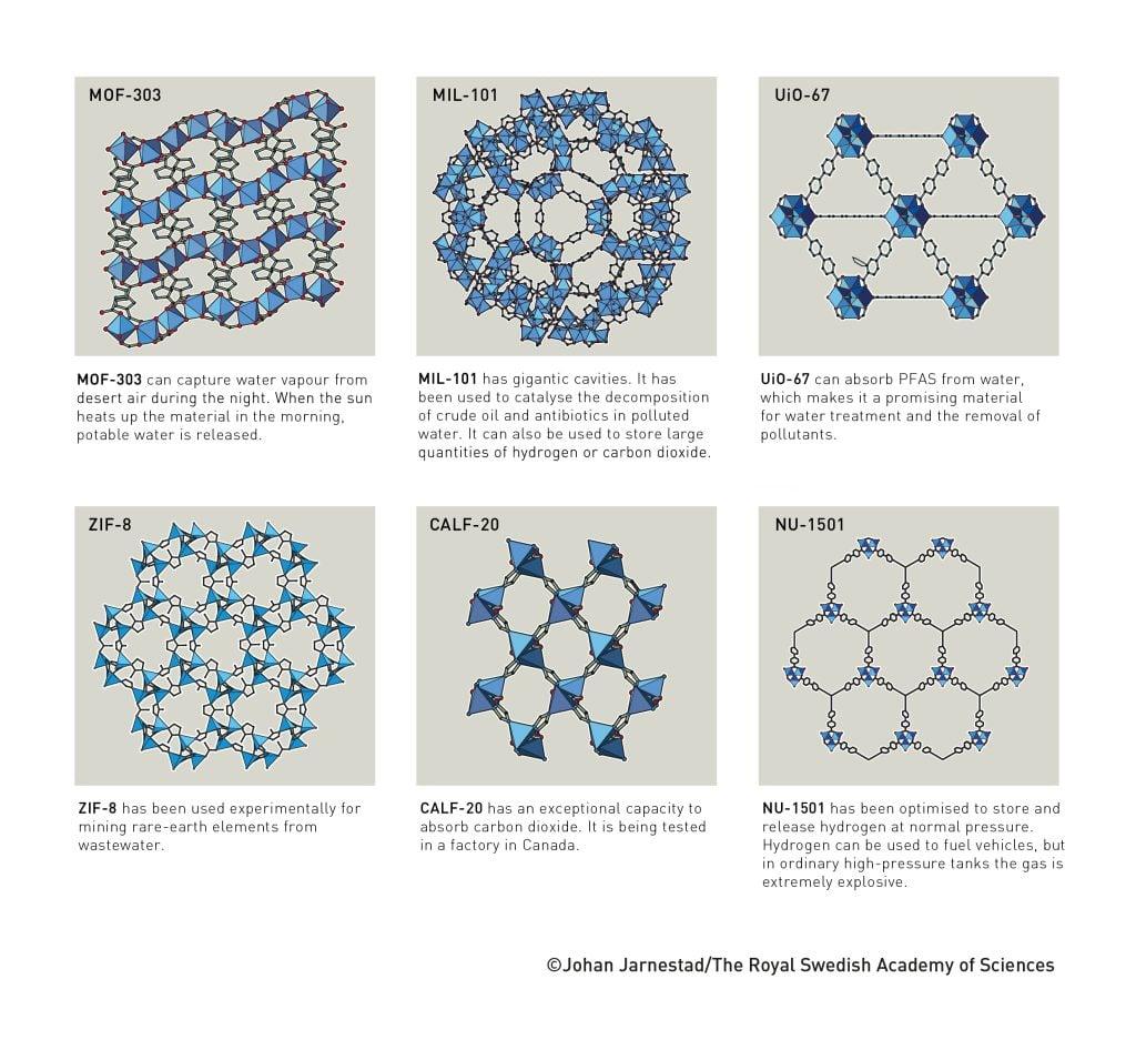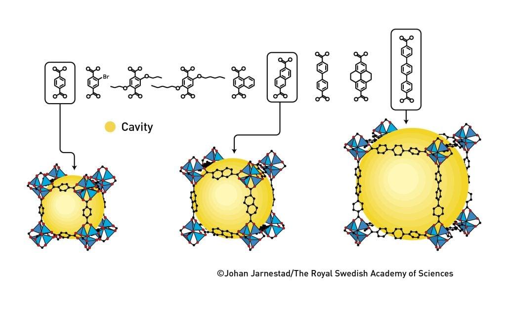 这种新型分子结构内部拥有大量空腔,分子可在其中自由进出。得益于三位科学家的工作,化学家如今已能设计出数以万计的不同MOF,为化学领域带来一连串“奇迹”。
