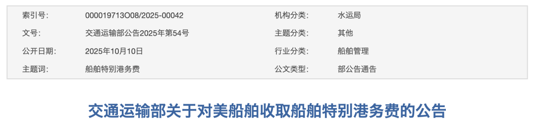 10月10日,交通运输部发布关于对美船舶收取船舶特别港务费的公告。