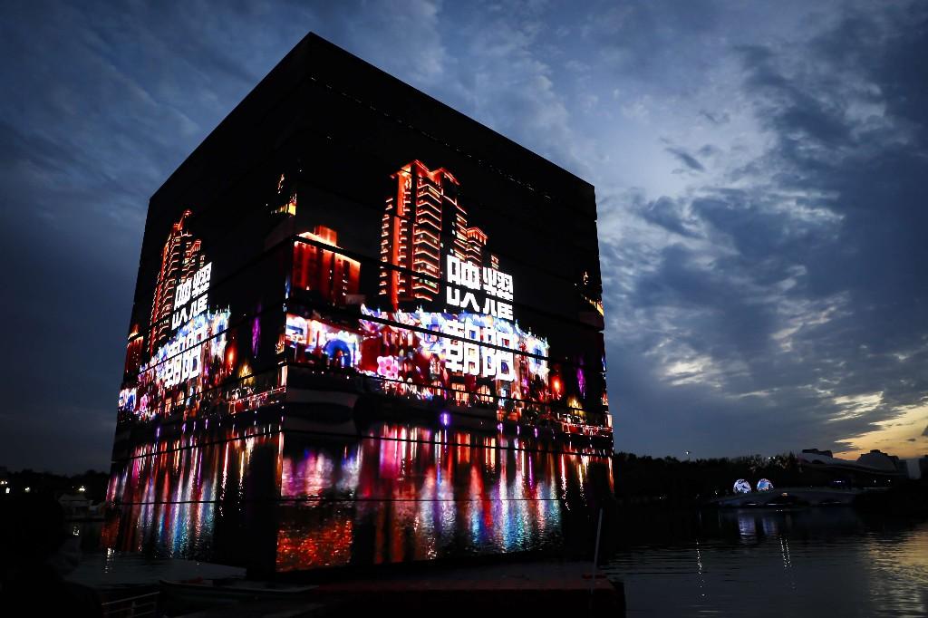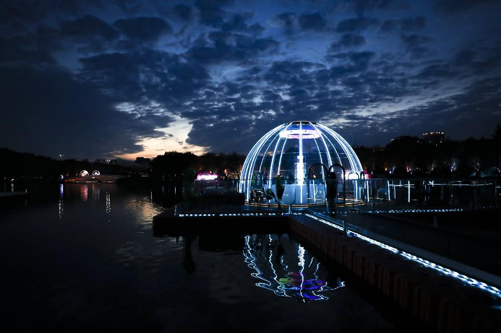 科技感是本届活动核心亮点。亮马河主会场的巨型“魔方”装置堪称科技标杆,直径13.5米的立方体搭配水上浮动平台,可一键切换多元场景,3D裸眼光影技术打造“盲盒现场”,用数字光影诠释“天圆地方”理念。“奇幻摩球”依托球幕投影与互动LED,将工业遗存化作“会呼吸的动态宇宙”,尽显数字文化活力。